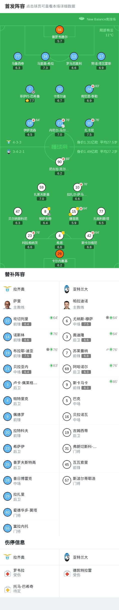 意杯半决赛首回合拉齐奥2-2亚特兰大,尤纳斯-穆萨绝平比分